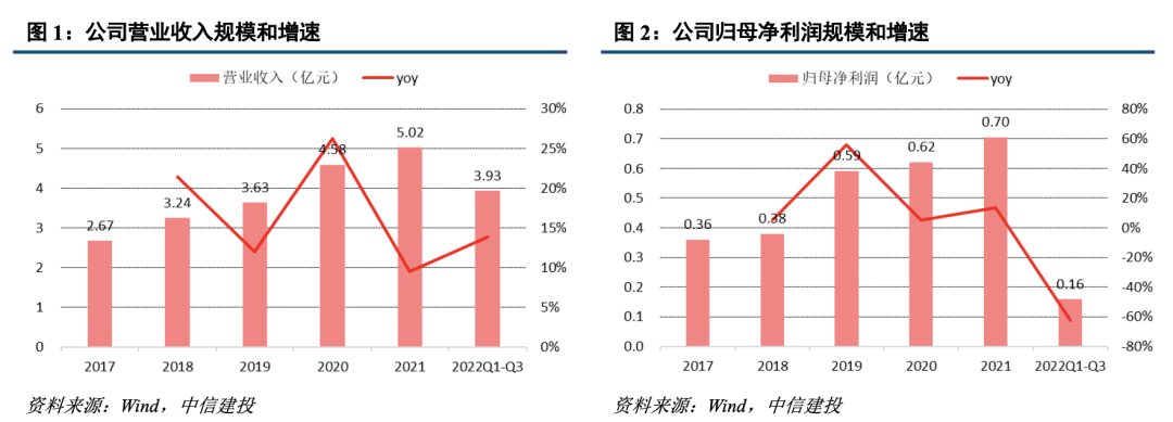公司主要从事过滤材料、烟气净化系列环保产品的研发、生产、销售,主要产品为各类耐高温耐腐蚀滤袋和 SCR 脱硝催化剂,可应用于电力、钢铁及焦化、垃圾焚烧、水泥和玻璃等行业。2017-2021年公司营业收入CAGR为17.11%,归母净利润CAGR为18.35%。