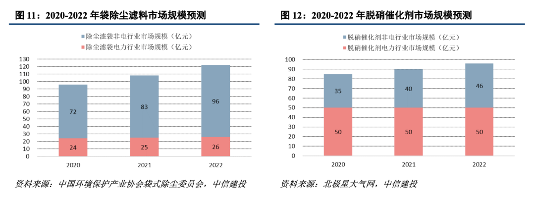 电力行业受益煤电投资,非电行业占比提升。电力为公司第一大业务,电力存量市场稳定,滤袋、脱硝催化剂市场规模分别为25、50亿元左右,在保供+调峰的迫切需求下,煤电投资开始重回增长,未来几年新增煤电机组有望触底反弹,为电力行业滤袋和脱硝催化剂带来新增安装需求。非电行业如钢铁、水泥、垃圾焚烧、平板玻璃、陶瓷、非电燃煤锅炉等将成为超低排放改造的主战场,提供主要增量,特别是水泥赛道,省市政策尚未完全跟进,催化剂整体改造率不足10%,空间广阔。预计2022年非电行业滤袋、脱硝催化剂市场规模分别为100、50亿元左右,公司产品从以电力行业为主向电力和非电协同发展转变,目前非电行业收入占比超过50%。随着国家环保政策趋严,竞争能力较弱的中小企业将不断退出,公司随着产能扩张逐步落地,市占率有望持续提升。
