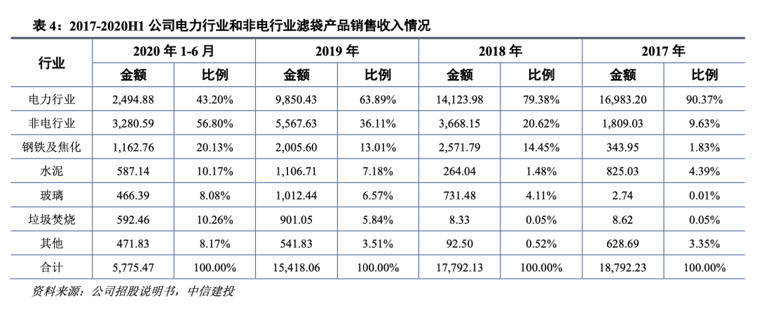 滤袋和催化剂都具备耗材属性,平均替换周期在3-4年。公司滤袋业务优势领域在电力和垃圾焚烧:电力行业价格因素占主导,公司市场份额前三;在垃圾焚烧领域,公司处于市场领先水平,凭借与垃圾焚烧最大厂商光大的深度合作积累了大量业务。公司催化剂业务优势领域在电力、钢铁、小锅炉:公司在区域性电厂和小锅炉领域市场份额前三,钢铁行业市场份额第一。
